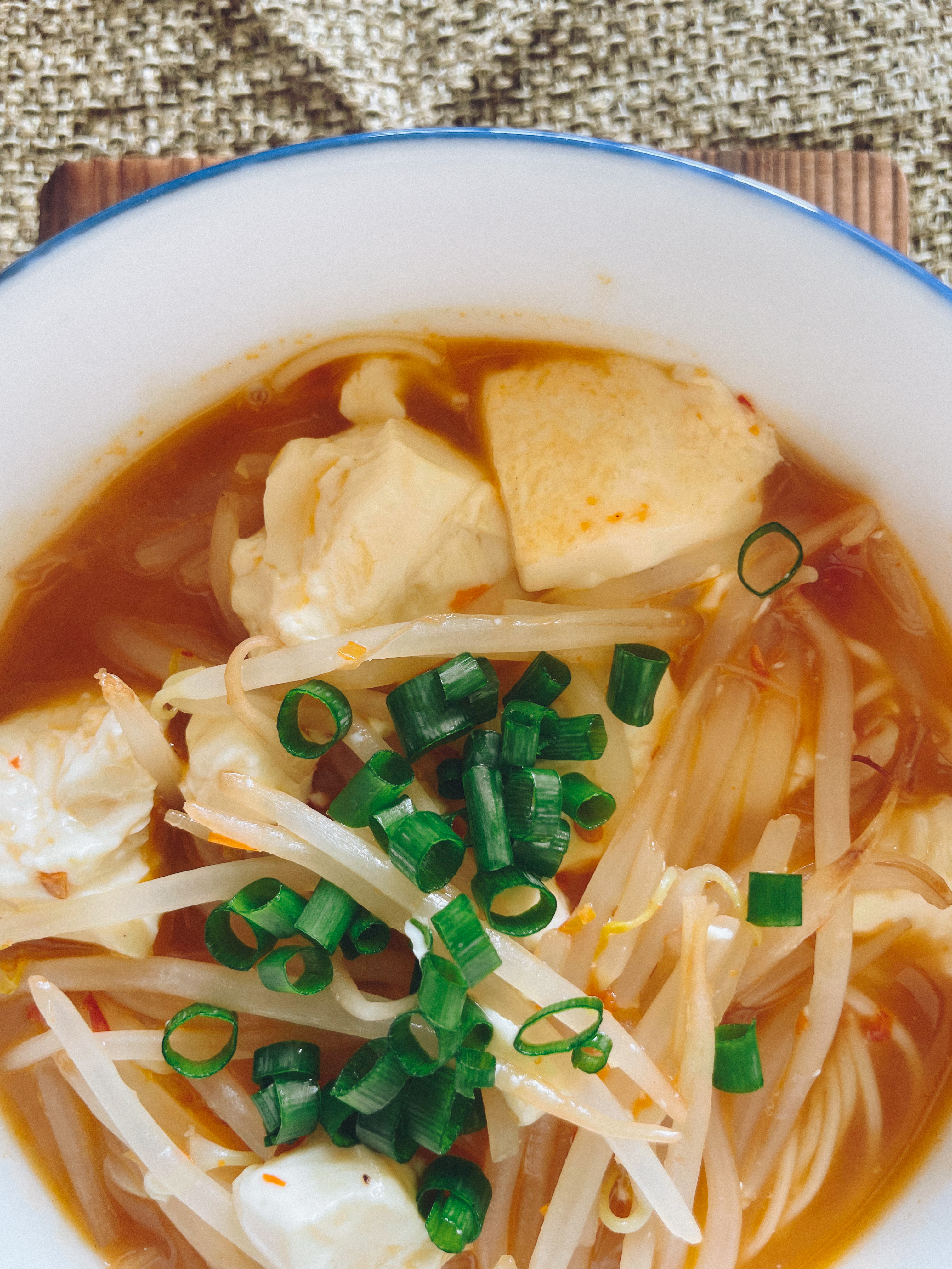 材料:そうめん、お湯、木綿豆腐、もやし、鶏ガラスープの素、ごま油、すりおろしニンニク、すりおろし生姜、豆板醤、コチュジャン、塩こしょう、小ねぎ