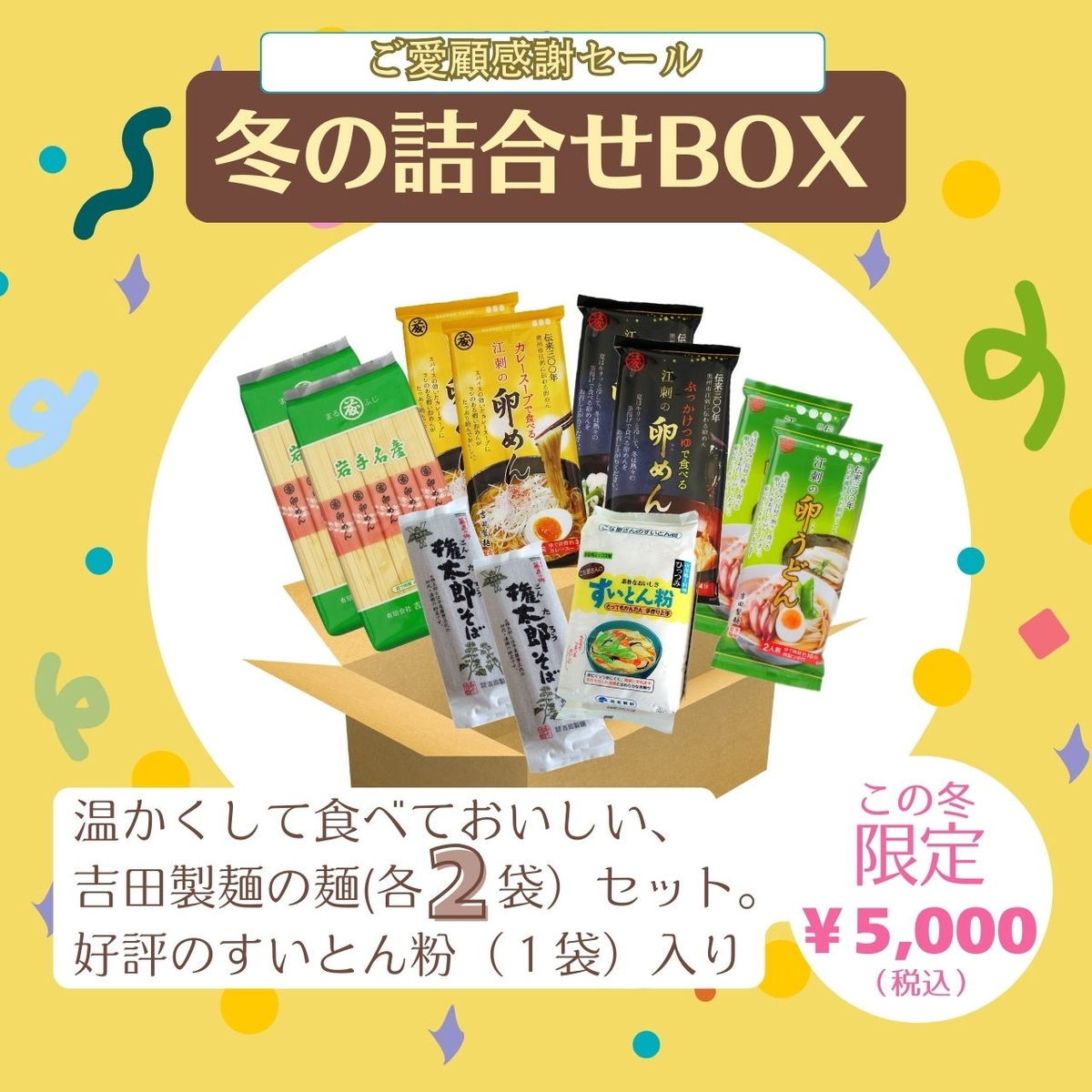 【冬限定BOX購入特典】公式ネットショップで次回のお買い物で使える10%OFFクーポン付き!※<ご愛顧感謝セール>冬限定のBOX2種いずれかをお買い上げの時に同送させていただく特典クーポンです。詳しくは本商品ご購入時、同送されるクーポンをご覧ください。 【冬限定・特典付き】冬の詰め合わせBOX 販売価格: 5,000円(税込み) 会員価格 (税込み) 通常価格 (税込み) 在庫 商品コード JANコード 数量 - + カートに入れる ツイートする シェアする