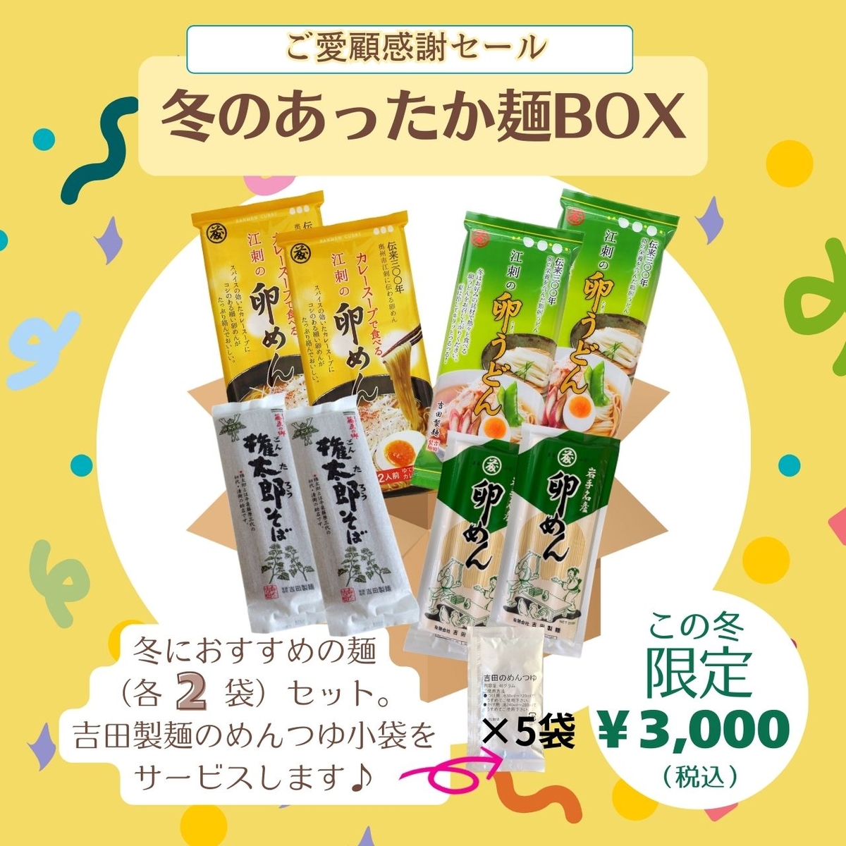 【冬限定BOX購入特典】公式ネットショップで次回のお買い物で使える10%OFFクーポン付き!※<ご愛顧感謝セール>冬限定のBOX2種いずれかをお買い上げの時に同送させていただく特典クーポンです。詳しくは本商品ご購入時、同送されるクーポンをご覧ください。 【冬限定・特典付き】冬のあったか麺BOX 販売価格: 3,000円(税込み) 会員価格 (税込み) 通常価格 (税込み) 在庫 商品コード JANコード 数量 - + カートに入れる ツイートする シェアする